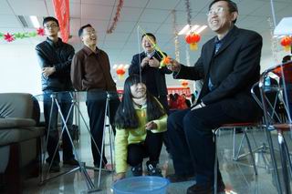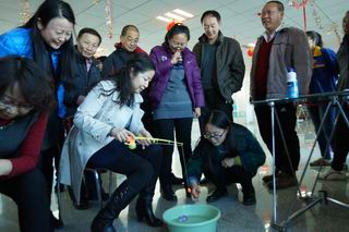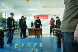 活動現(xiàn)場張燈結(jié)彩,一片歡聲笑語。金鉤釣魚、好運(yùn)飛鏢、幸福圈套、隔桌吹蠟、快樂乒乓夾、蒙眼摸鼻等六個貼近生活、充滿趣味的游藝項(xiàng)目,給廣大教職工奉獻(xiàn)了一頓豐富多彩的娛樂大餐。游藝中,有比技巧的,有比準(zhǔn)勁的,有比運(yùn)氣的……大家個個勁頭十足,一改往日的嚴(yán)謹(jǐn),沉醉在游戲帶來的樂趣之中,盡情釋放著平日工作的壓力,盡情享受著游戲活動帶來的快樂,一年以來教書育人的辛勞在這一刻全部隨著2015年蕩滌而去,新一年熱火朝天的干勁油然而生。