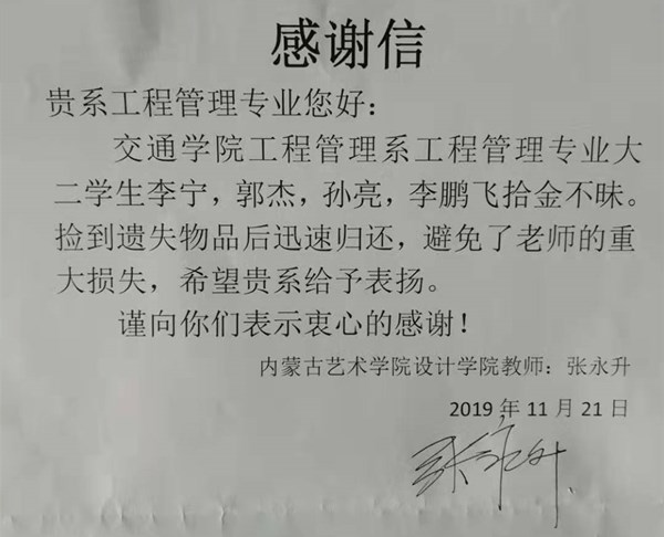 11月21日上午,工程管理系黨總支收到了藝術(shù)學(xué)院張永升老師送來(lái)的感謝信,感謝高管31班李明、霍杰、孫亮、李鵬飛四位拾金不昧、熱心助人的好青年。