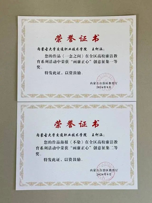 學院機械工程系輔導員王柯涵在全區(qū)高校廉潔教育系列活動中榮獲雙獎,憑借其創(chuàng)作的廉潔主題作品,在"畫廉政心"創(chuàng)意征集單元中脫穎而出,其作品《一念之間》榮獲一等獎,作品《不染》榮獲二等獎。